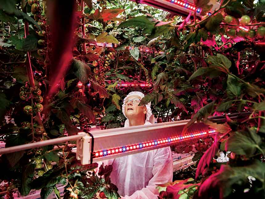 A conversa precipita-se na direcção do uso de iluminação LED para viabilizar o cultivo em estufas com controlo climático rigoroso 24 horas por dia. De seguida, desvia-se para a percepção errónea de que a agricultura sustentável significa intervenção humana mínima na natureza.