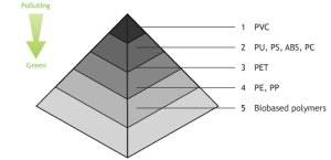 A Greenpeace criou a pirâmide de plásticos em função do impacto ambiental que cada um provoca. No topo temos o PVC, com maior impacte, seguido de PU,PS,ABSD e PC,em seguida o PET e logo o PE e PP e finalmente os plásticos de bio-polímeros.