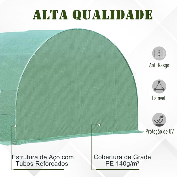 - A estufa é fabricada com materiais de qualidade (aço e polietileno) para resistir às intempéries. A estrutura do tubo é em aço com revestimento de pó, e a tela é em polietileno, robusta, de grande durabilidade e resistente aos raios UV e roturas;