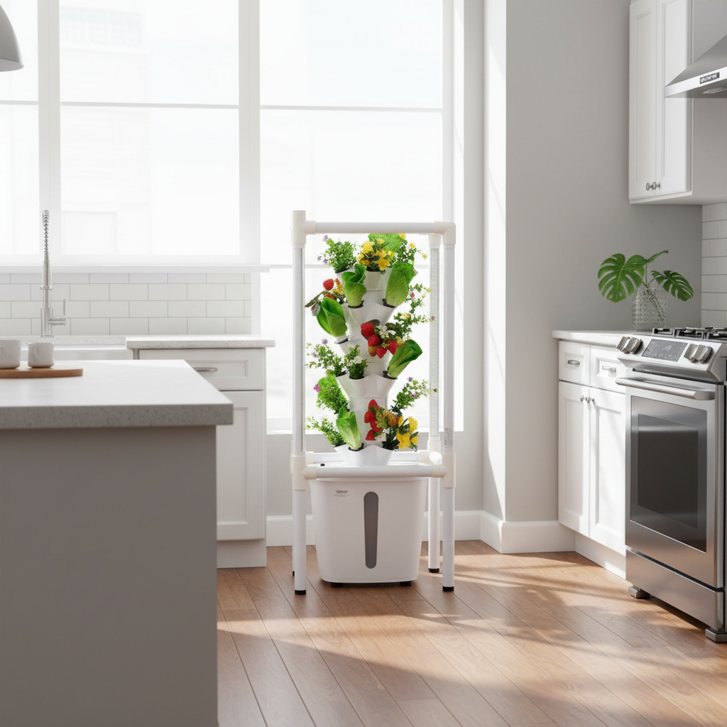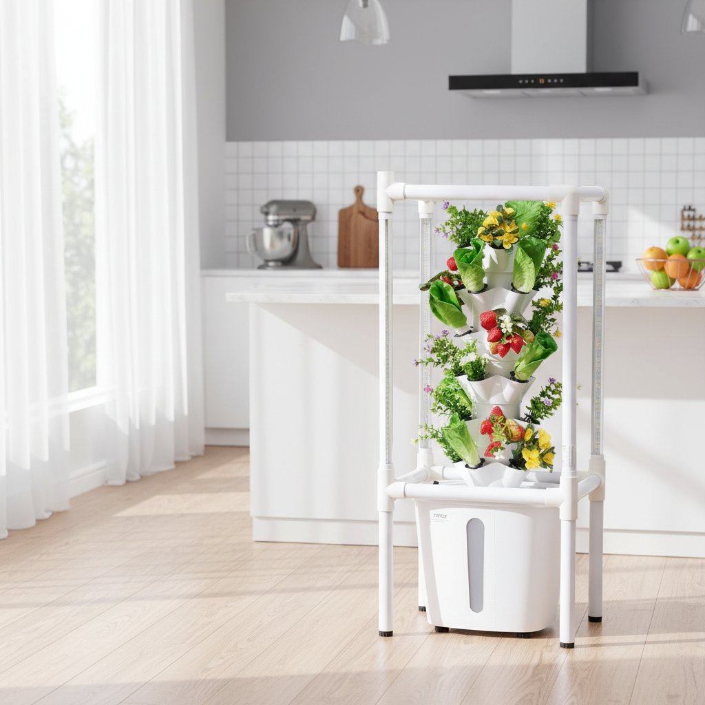 Cultiva até 30 plantas durante todo o ano com esta torre de aeroponia vertical com iluminação LED integrada, ideal para quem quer produzir alimentos frescos em casa, mesmo com pouca luz natural. Compacta, eficiente e fácil de usar, é perfeita para cozinhas, varandas e apartamentos.