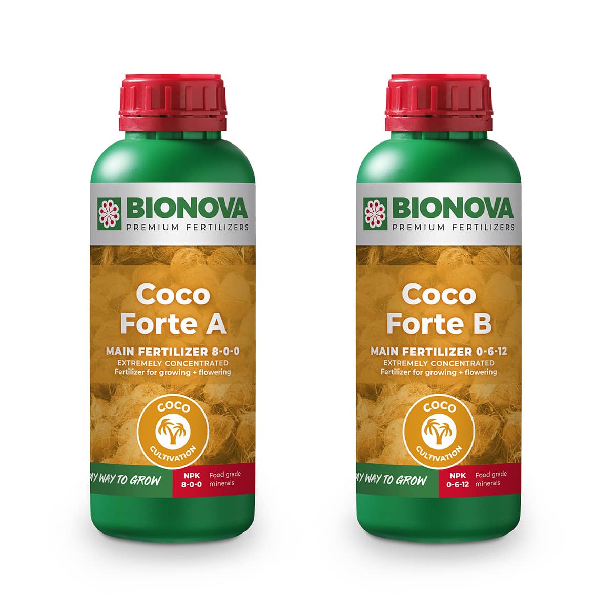 Coco Forte A + B é uma solução nutritiva completa de qualidade "Food-Grade", e os oligoelementos são quelados para que possam ser absorvidos numa faixa maior de pH. A aplicação desses fertilizantes é bastante fácil e restringe-se a medir as quantidades iguais de Coco Forte A + B e misturá-los na água um de cada vez. Vários elementos foram adicionados a este fertilizante A + B, que garantem um ótimo crescimento e floração sobre substratos de coco, em particular no caso de reutilização. Certifique-se de que o substrato esteja livre de doenças, pragas ou vírus em caso de reutilização.