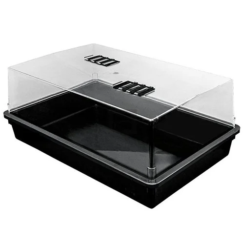 Esta mini-estufa Propagador PRO 70, é um propagador de plástico rígido de alta qualidade, preparado para uso profissional. É composto por duas peças: uma base (bandeja resistente) e uma cúpula de metacrilato, com duas janelas de ventilação na parte superior. Inclui igualmente uma prática manta de rega, para manter a humidade constante.